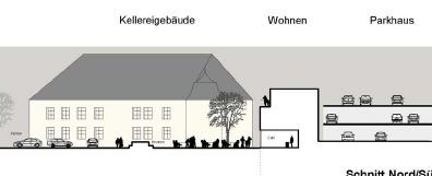 Der Kellereiplatz zoniert sich von innen nach außen, um Aufenthaltsqualität, Wegeführung und parkende Autos miteinander verträglich zu organisieren